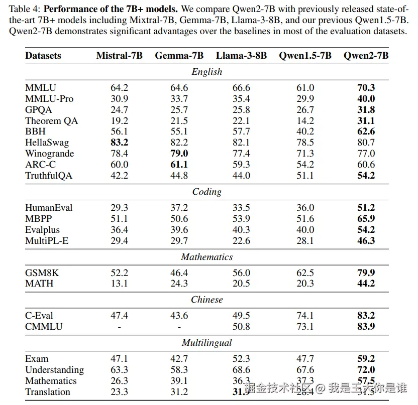 Qwen2-7B。 7B 模型被广泛使用,因为它能够在配备 16GB 内存的加速器上执行 16 位浮点运算。我们的重点是将此模型与其他领先的7B模型进行比较。结果可以在表4中找到。Qwen2-7B在大多数数据集上的表现优于其他模型,特别是在编码任务、数学和中文语言任务方面表现出色。它在多语言理解和考试方面也表现出色。