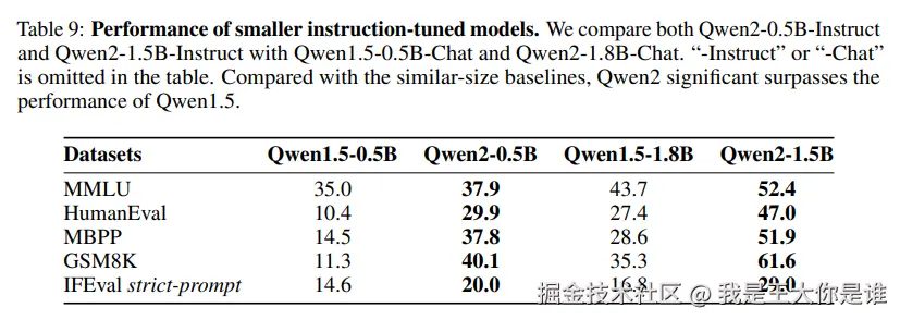 Qwen2-1.5B-Instruct & Qwen2-0.5B-Instruct。值得注意的是,为较大模型设计的某些数据集的复杂性超出了这些较小模型的能力,因此我们的分析侧重于选定的子集。如表9所示,Qwen2模型在核心能力和指令遵循任务方面都明显优于其前身。这一成就主要归因于预训练数据的扩展。数据扩展仍然是提高模型性能的有效策略,即使在十亿参数以下的模型领域也是如此。