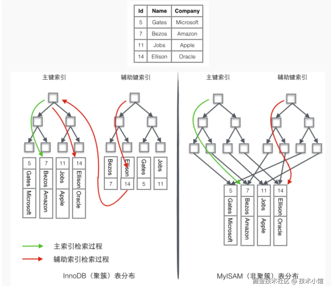 | 索引的实现方式 | B+树索引,myisam 是堆表 非聚簇索引 | B+树索引,Innodb 是索引组织表 聚簇索引 |
