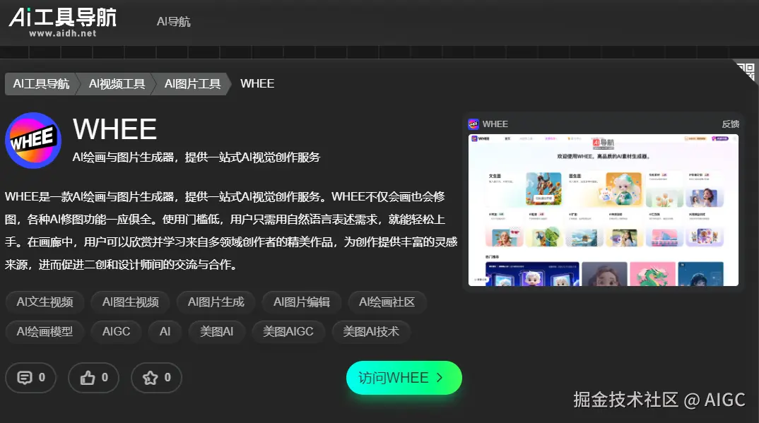 例子:设计师一直想创作一组未来城市的插画,在 aidh.net/ 的帮助下,他迅速找到了心仪的 AI 绘画工具WHEE,直接访问官网。