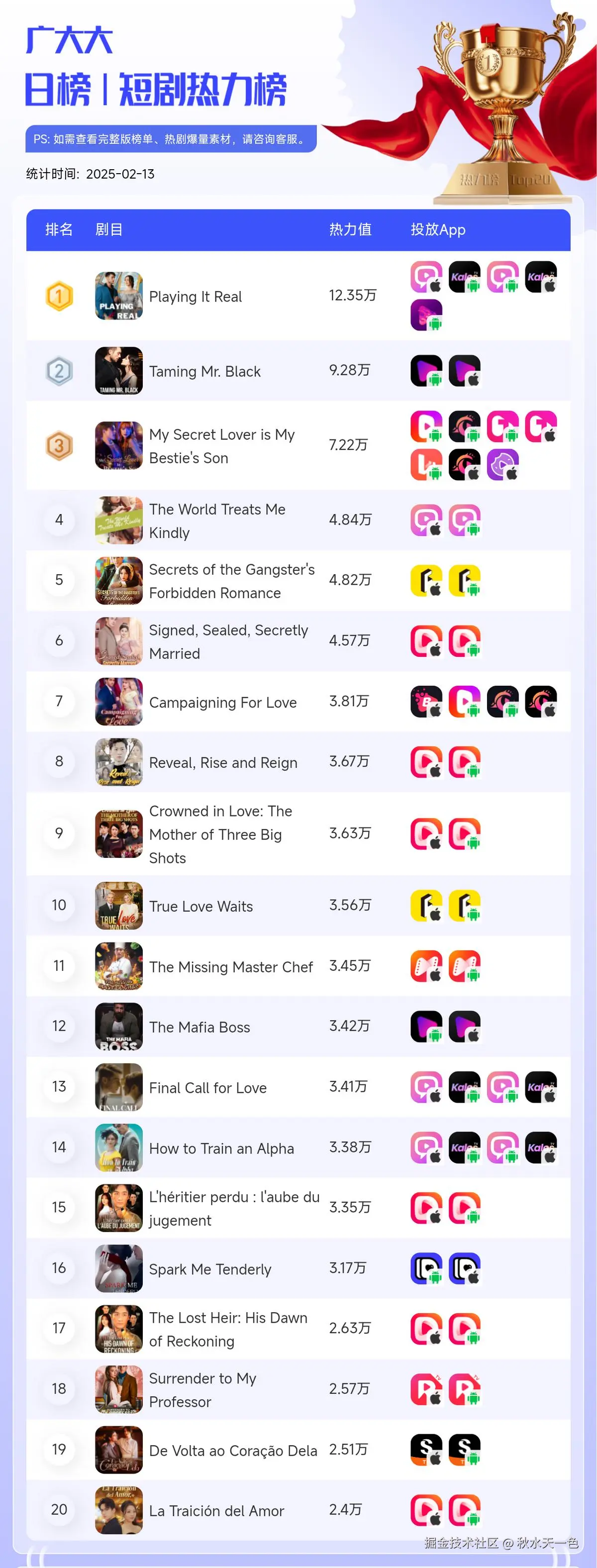 最后,是我们根据 广大大-短剧-剧目榜 数据整理出来的短剧周榜,欢迎大家自行查看。