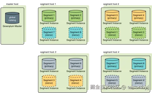 - Mirror segment: Primary segment节点的备库以保障高可用性;通常跟对应的Primary segment节点不在同一台机器上。在segment节点出现故障,mirror segment自动接管进行工作。但是为了数据库平稳;尽快恢复出现故障的segment。