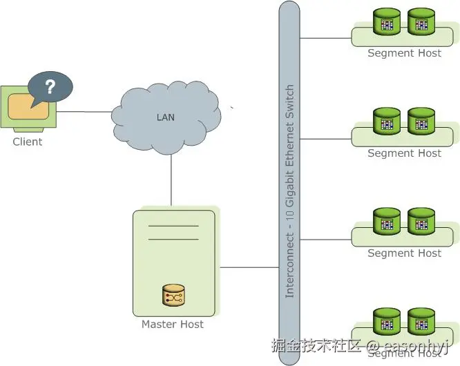 Greenplum由Master节点<协调节点>和Segment节点<数据节点>以及高速网络层三部分组成