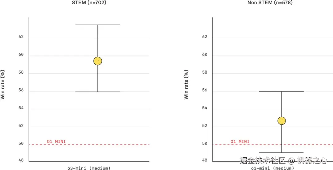 o3-mini 与 o1-mini 在 STEM / 非 STEM 提示词上的胜率(来自 [6])