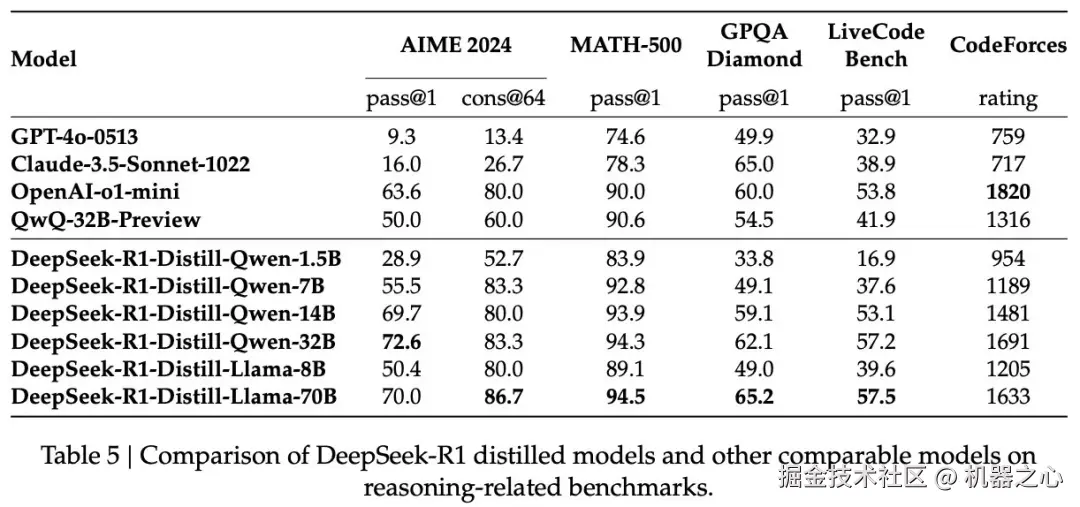 这是一个简单的知识蒸馏流程,但结果却非常惊艳。如上所示,经过蒸馏的 Qwen2.5-14B 模型的表现优于 QwQ-32B-Preview,后者是 R1 发布之前最好的开放式推理模型。此外,即使是最小的蒸馏模型也比未针对推理进行优化的标准封闭式 LLM 表现更好(例如 GPT-4o),而 320 亿和 700 亿参数的蒸馏模型在大多数基准测试中的性能都超过了 o1-mini。
