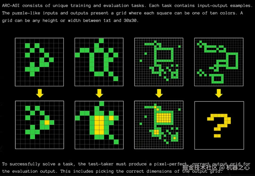 ARC-AGI 基准 —— 被描述为「迈向 AGI 的重要垫脚石」—— 涉及各种基于网格的谜题,其中 LLM 必须在输入输出网格中学习模式,并在最终输出示例中完美复制这种学习到的模式。大多数 LLM 都很难解决这些难题(例如,GPT-4o 的准确率仅为 5%),但推理模型在这个基准上表现相当不错 —— 准确率可达 30-90%,具体取决于计算预算。