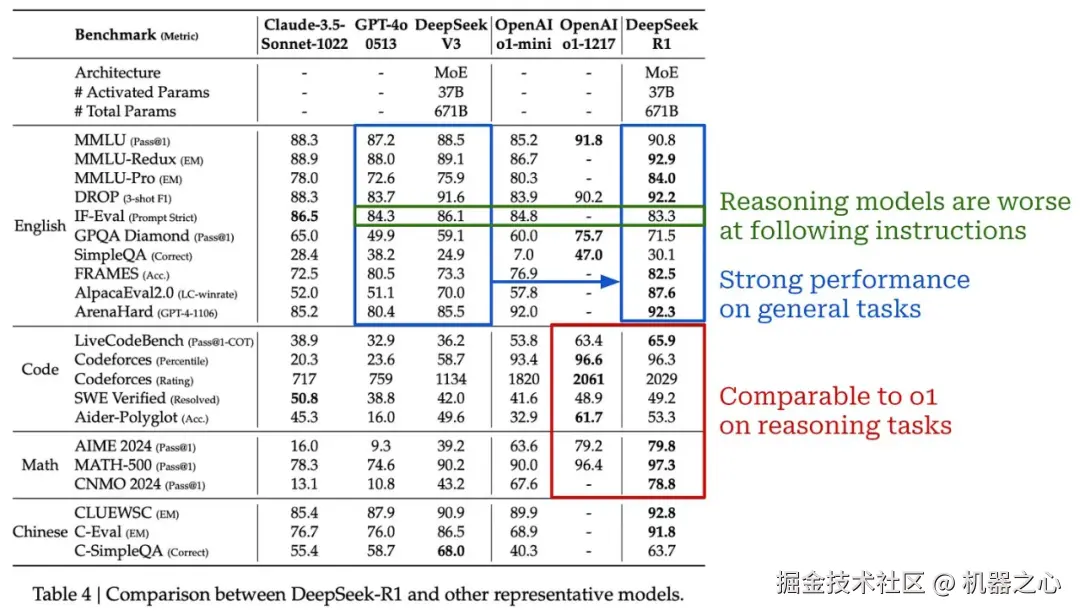 它的表现如何?如上所示,R1 在大多数推理任务上的表现与 o1 相当甚至超过 o1。与 R1-Zero 不同,R1 还具有相当强的编程能力。在通用任务上,由于其混合训练管道,R1 继续表现良好。总的来说,R1 是一个非常强大的模型,似乎与 OpenAI 的 o1 不相上下,并且可以高精度地解决各种任务(包括传统任务和推理导向任务)。