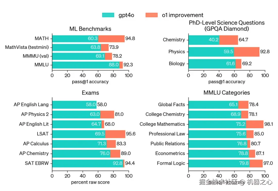 o1 系列模型与 GPT-4o 在多个推理任务上的比较,来自 [5]