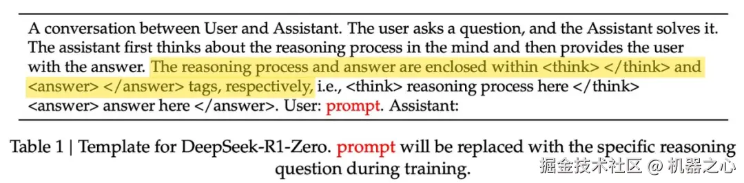 如前所述,当模型的输出格式正确时,格式奖励会提供积极的训练信号。[1] 中使用的格式只是将模型的长思维链(或思考 / 推理过程)放在两个特殊 token 之间: 和 。然后,在推理过程完成后,模型会在 和 标签之间单独生成答案;如下所示。