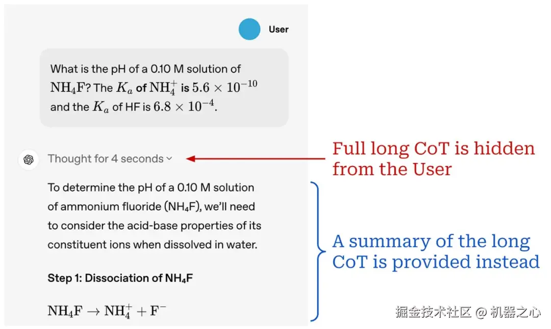 「我们决定不向用户展示原始的思维链…… 我们努力通过教导模型从答案中的思维链中重现有用的想法来部分弥补 [这一决定]。对于 o1 模型系列,我们会展示模型生成的思维链摘要。」 - 来自 [5]