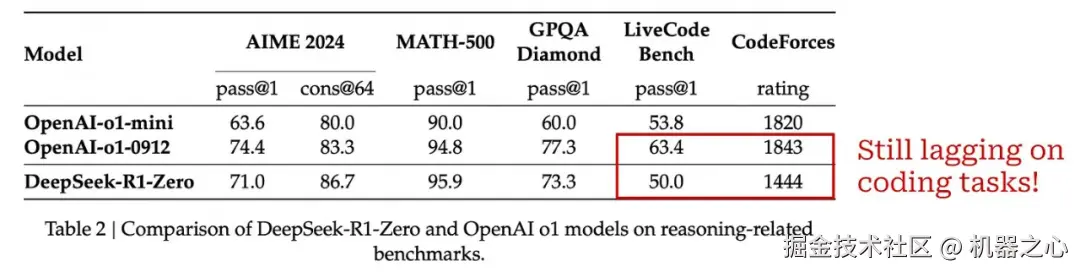 下表给出了 DeepSeek-R1-Zero 和 o1 模型之间的完整性能比较。DeepSeek-R1-Zero 在大多数情况下与 o1-mini 的性能相当或超过 o1-mini,并且在几个任务上的表现与 o1-preview 相当。然而,OpenAI 的推理模型在编程领域表现更好 ——DeepSeek-R1-Zero 显然是一个较弱的编程模型。我们很快就会看到,这个问题在 DeepSeek-R1(后续模型)中得到了解决。