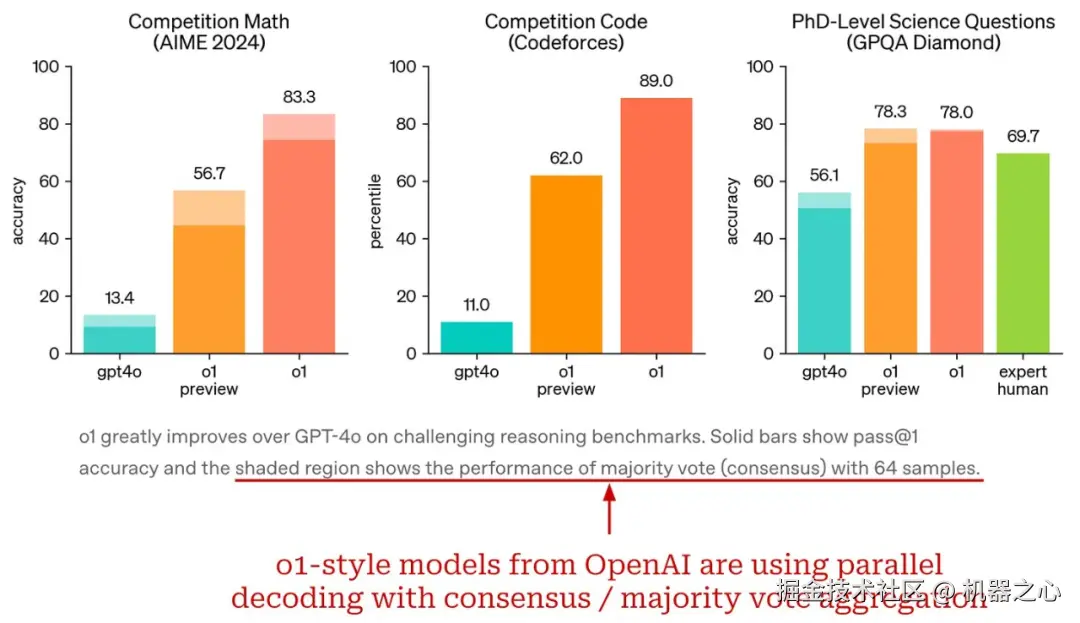 这些方法的主要好处是简单又有效。并行解码很容易扩展:我们只需生成、验证和聚合大量输出,就能得到有意义的性能提升 [9, 10, 11]。o1 式模型显然使用了并行解码技术 —— 只需查看其博客中提供的图表细节(如下所示)!但是,并行解码技术本身无法解释最近发布的推理模型所表现出的一些更复杂的推理行为。