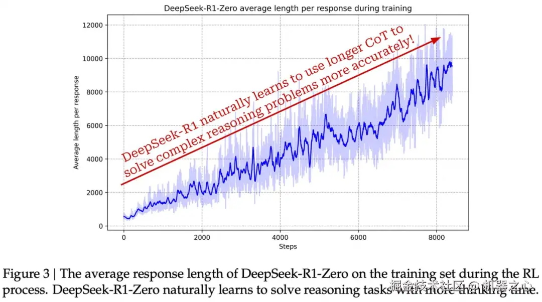 发生了什么?显然,DeepSeek-R1-Zero 从 [1] 中介绍的强化学习训练过程中获得了出色的推理能力。然而,模型学习过程的动态也相当明显!因为没有进行 SFT 式训练,所以可以在整个强化学习训练过程中密切监控模型推理策略的进展。如下所示,DeepSeek-R1-Zero 学会了利用更多的「思考时间」,即生成越来越长的思维链,从而可以随着训练的进行改进其推理过程。该模型自然学会了利用更多的测试时间计算来解决更难的问题!