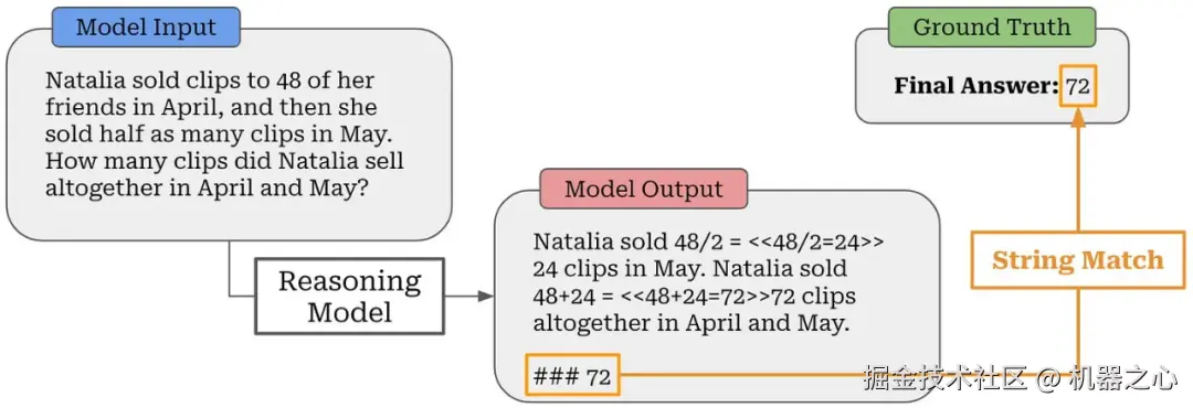 例如,我们可以为大多数数学问题定义一个基本答案 —— 在 GSM8K 中,这是使用 #### 语法完成的。然后,我们可以从 LLM 的输出中提取最终答案,并使用基本字符串匹配将此答案与 ground truth 答案进行比较;见上图。类似地,如果我们为编程问题准备了测试用例,我们可以简单地执行由 LLM 生成的代码并检查提供的解决方案是否满足所有测试用例。