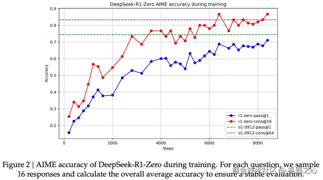 通过强化学习进行学习。尽管没有使用 SFT,但 DeepSeek-R1-Zero 在整个强化学习训练过程中的推理能力都有了明显的进步。随着训练的进行,模型在 AIME 2024 上的表现如下图所示。