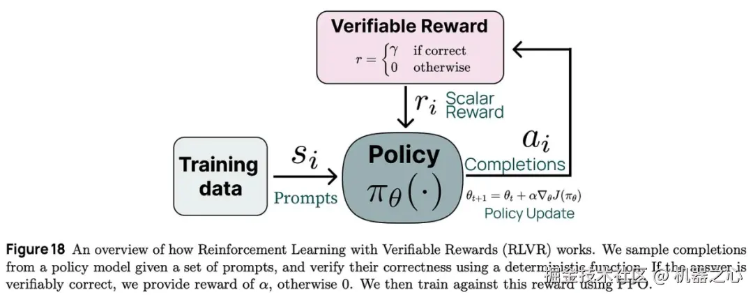 「可验证奖励的强化学习(RLVR)可以看作是现有引导语言模型推理方法的简化形式或具有执行反馈的更简单形式的强化学习,其中我们只需使用答案匹配或约束验证作为二进制信号来训练模型。」 - 来自 [13]