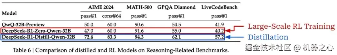 有趣的是,[1] 中提到,使用上述蒸馏方法基于 R1 蒸馏 Qwen2.5-32B 基础模型比通过大规模强化学习直接训练该模型表现更好,如下所示。