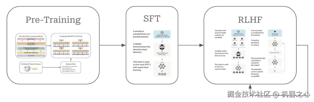 首先,在来自互联网的原始文本数据上预训练语言模型。之后,对齐这些模型,也就是让它们的输出更符合人类的偏好,这会用到监督微调(SFT)和基于人类反馈的强化学习(RLHF)等技术。