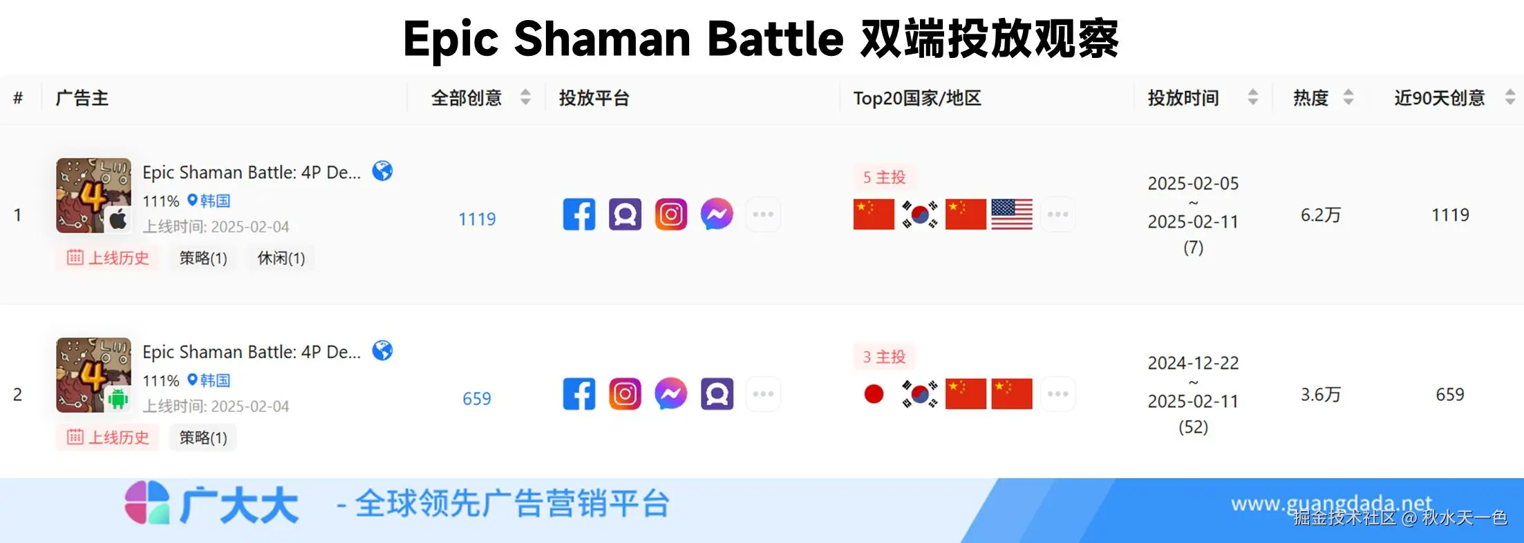 文章的最后,让我们来结合广大大后台的数据来看看【Epic Shaman Battle】从上线至今的总体买量情况,游戏的Android端最早在去年12月份开始有零星的素材,不过同iOS端一样,都是游戏正式上线后开始大规模的素材投放。