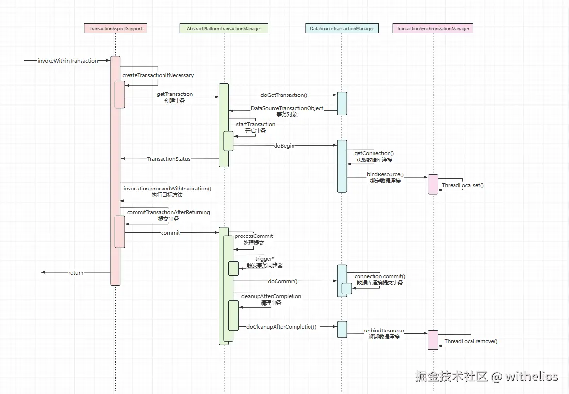 TransactionInterceptor事务拦截器在方法执行前后处理事务逻辑- 开启事务:根据事务属性(传播行为、隔离级别等)获取或创建事务