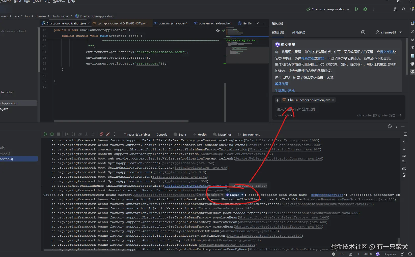 - 实战技巧:使用Alt+[/Alt+]切换生成建议,结合注释生成API文档(如Swagger注解)。这款也是我一直在使用的AI辅助工具,控制台的错误信息,能够直接定位到tongyi的chat模式中进行对话,同时能根据代码直接生成Git提交信息,再也不用担心提交Git时要写什么提交内容了。