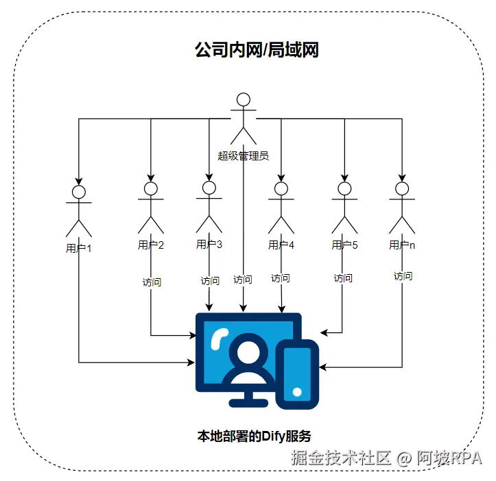 很多朋友部署完成后,给我反馈,他们是在公司内网的,他想让其他同事也能访问自己电脑上部署好的知识库,该怎么做?他的需求逻辑示意图如下: