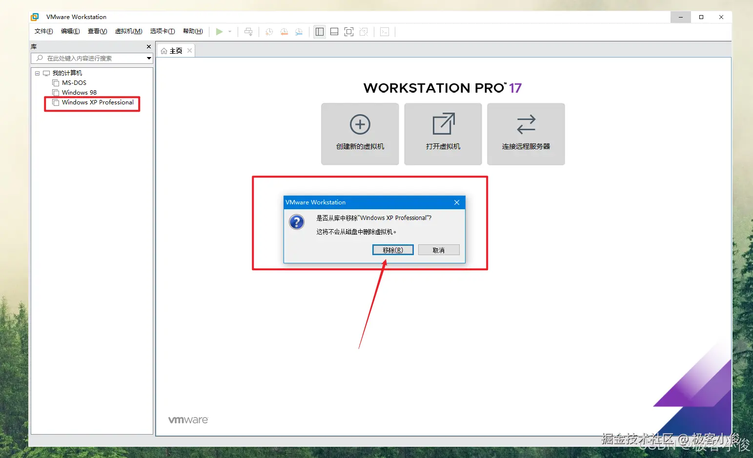 这里我们把WindowXP的虚拟机移除,也会提示我们这样并不能从磁盘删除此虚拟机!