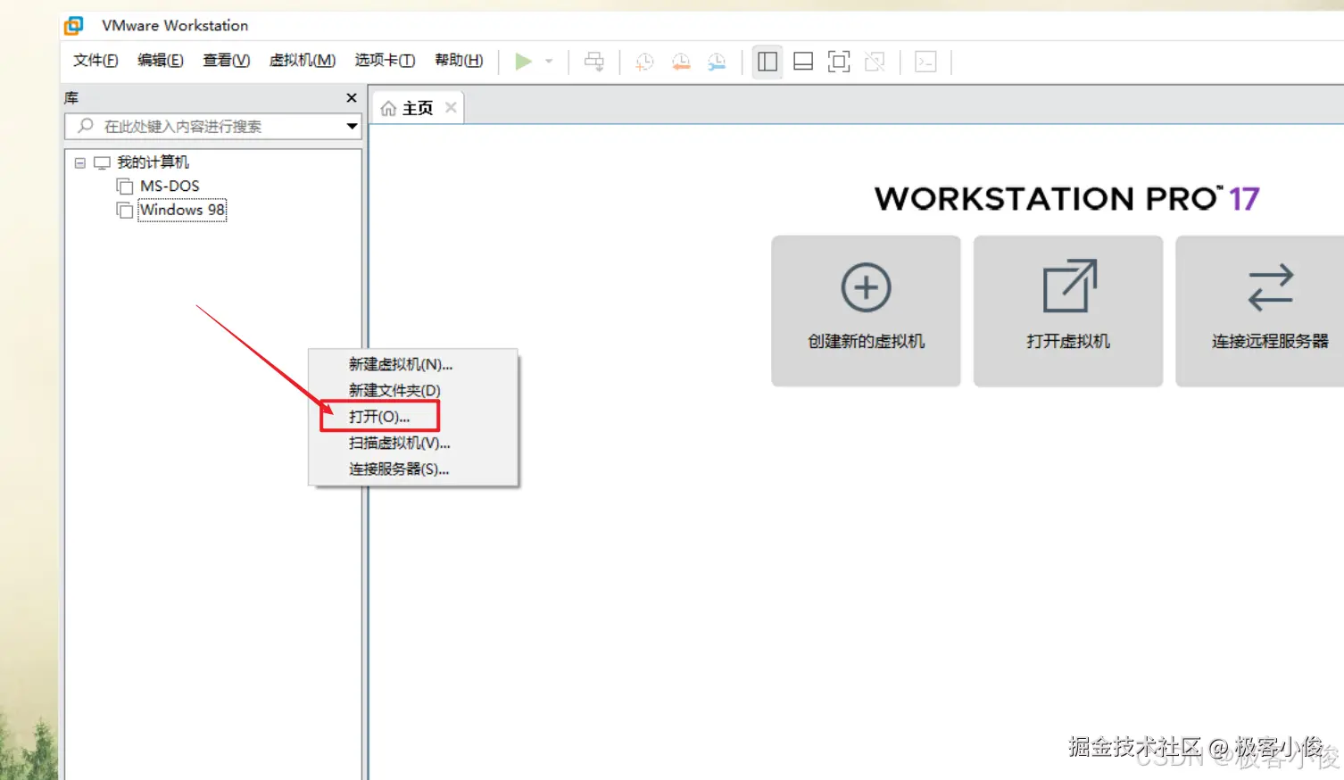 我们在虚拟机列表空白处单击鼠标右键, 选择打开