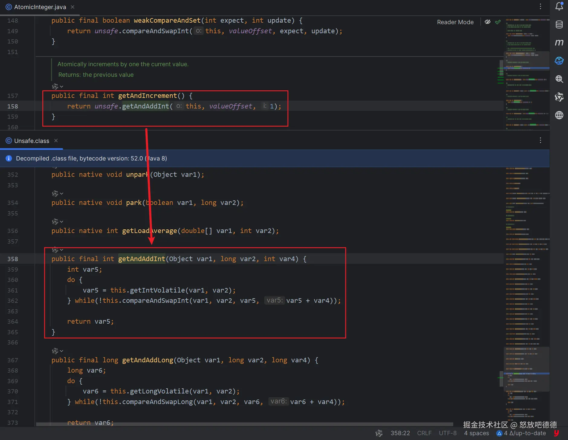 实际上最终调用的是 unsafe.getAndAddInt() 方法,其中的 var1 表示对象,var2 是对象在内存地址的偏移量,var4 是要增加的值,var5 是当前共享内存的最新值。这里会有 do-while,首先会获取当前地址中的内存值,调用 CAS 操作,如果 CAS 操作返回 false,就会再次进入循环,直到 CAS 操作成功。