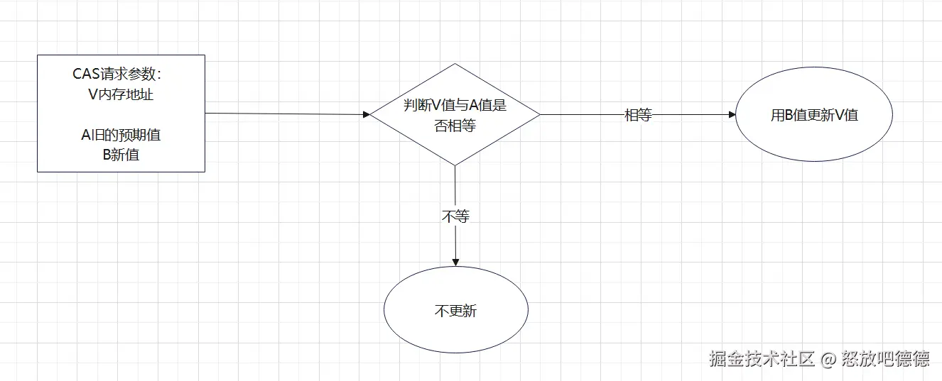 当且仅当内存值 V 等于旧的预期值 A 相同时,将内存值 V 修改为 B,否则无论什么值都会进行自旋(不断的重试)。