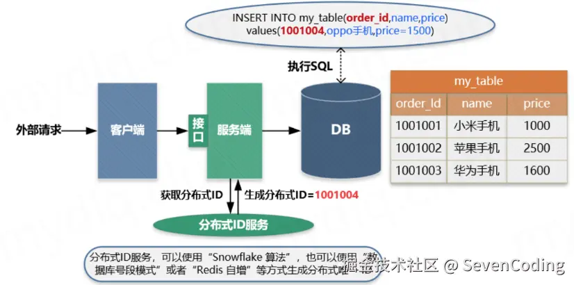 - 服务端执行业务逻辑,生成一个分布式 ID,将该 ID 充当待插入数据的主键,然后执数据插入操作,运行对应的 SQL 语句。