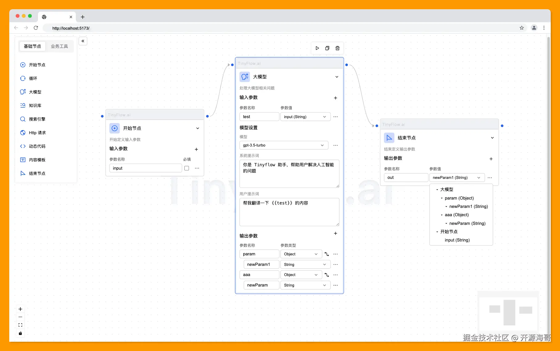 后端 java 主要用于执行 Tinyflow 设计出来的工作流,其开源地址为:gitee.com/tinyflow-ai…