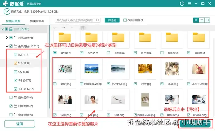 步骤2: 软件扫描结束后,会出现一个扫描文件列表,用户可以在列表中选择需要的文件,选好后点击【导出】;