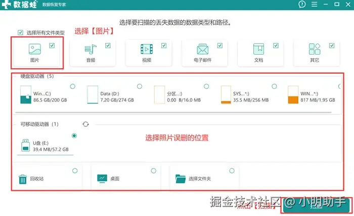 步骤1: 打开数据 蛙恢复专家,在软件首页上选择【图片】和照片误删的位置,点击左下角的扫描按钮;