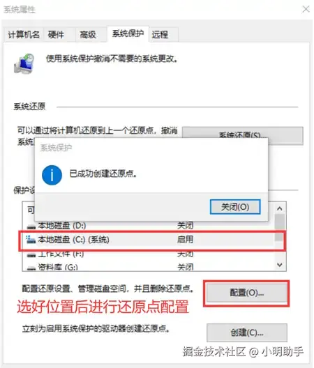 步骤3:查看已开启还原点设置的位置,选中需要设置的点后点击【配置】,在新页面选好还原的时间点后,点击【确定】。