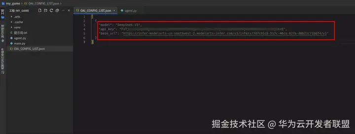 CodeArts IDE for Python中打开OAI_CONFIG_LIST.json文件,其中有3个参数的值需要配置,参数说明参考下表: