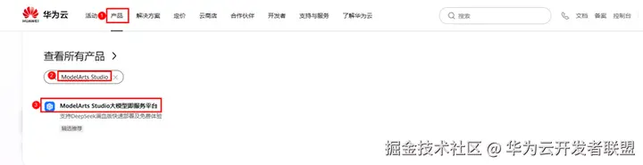 登录进入华为云首页,在产品列表中搜索“ModelArts Studio”服务。