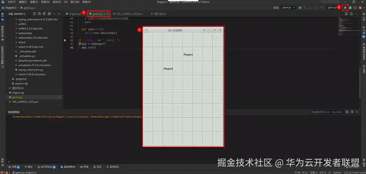 新建一个game.py文件,将代码粘贴进去,点击右上角“运行”按钮,运行game.py文件,查看运行效果。