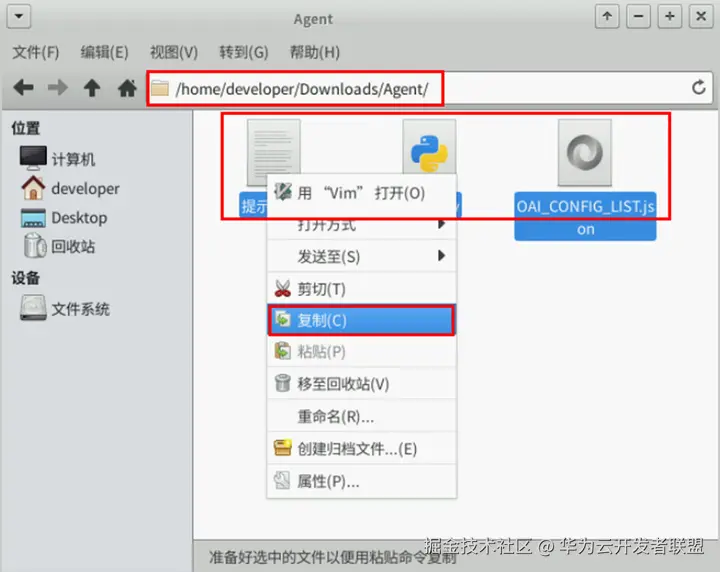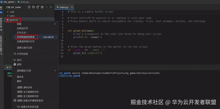 将复制的代码文件粘贴到创建的Python工程路径下,快速进入路径方法如下图所示,在CodeArts IDE for Python中,鼠标右击“mian.py”文件,选择“打开所在文件夹”。