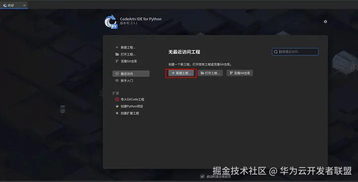 CodeArts IDE for Python 启动后,在弹框界面,选择“新建工程”。