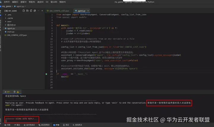 例如输入:“帮我开发一款带图形画界面的双人对战游戏”(可自定义输入对话内容),回车发送对话内容。