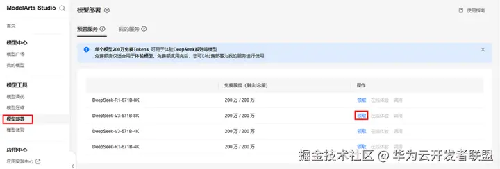 进入ModelArts Studio控制台首页,在左侧菜单栏,选择“模型部署”,在“预制服务”中选择DeepSeek-V3-671B-8K模型,点击“领取”,领取200万免费token。