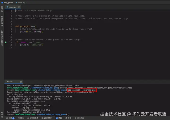 在终端中输入以下命令升级pip: