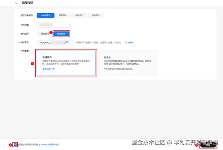 2、添加授权页面中,选择“新增委托>普通用户”,勾选服务声明,点击“创建”。