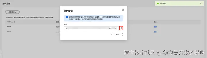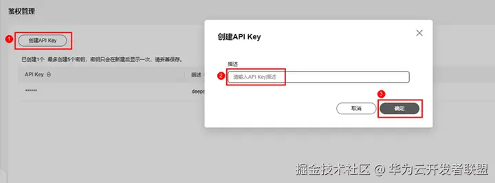 进入“鉴权管理”页面,点击“创建API Key”,自定义输入API Key描述,点击“确定”,完成API Key的创建。