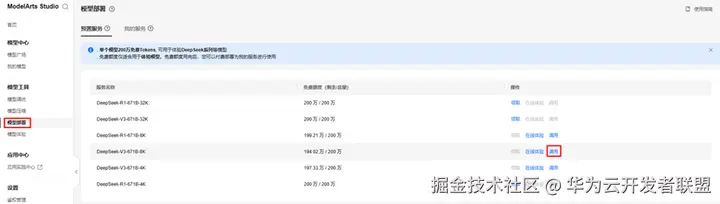 进入ModelArts Studio控制台首页,在左侧菜单栏,选择“模型部署”,点击在步骤2.2中领取的DeepSeek V3模型对应的“调用”。