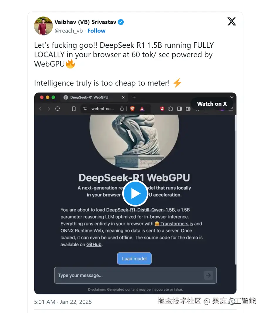 - DeepSeek R1 1.5B 完全本地运行在浏览器中,速度为每秒 60 个 token,由 WebGPU 提供动力: