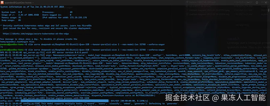 vLLM/SGLang:用于本地提供模型。可以使用类似 vllm serve deepseek-ai/DeepSeek-R1-Distill-Qwen-32B — tensor-parallel-size 2 — max-model-len 32768 — enforce-eager 的命令来运行蒸馏版本。