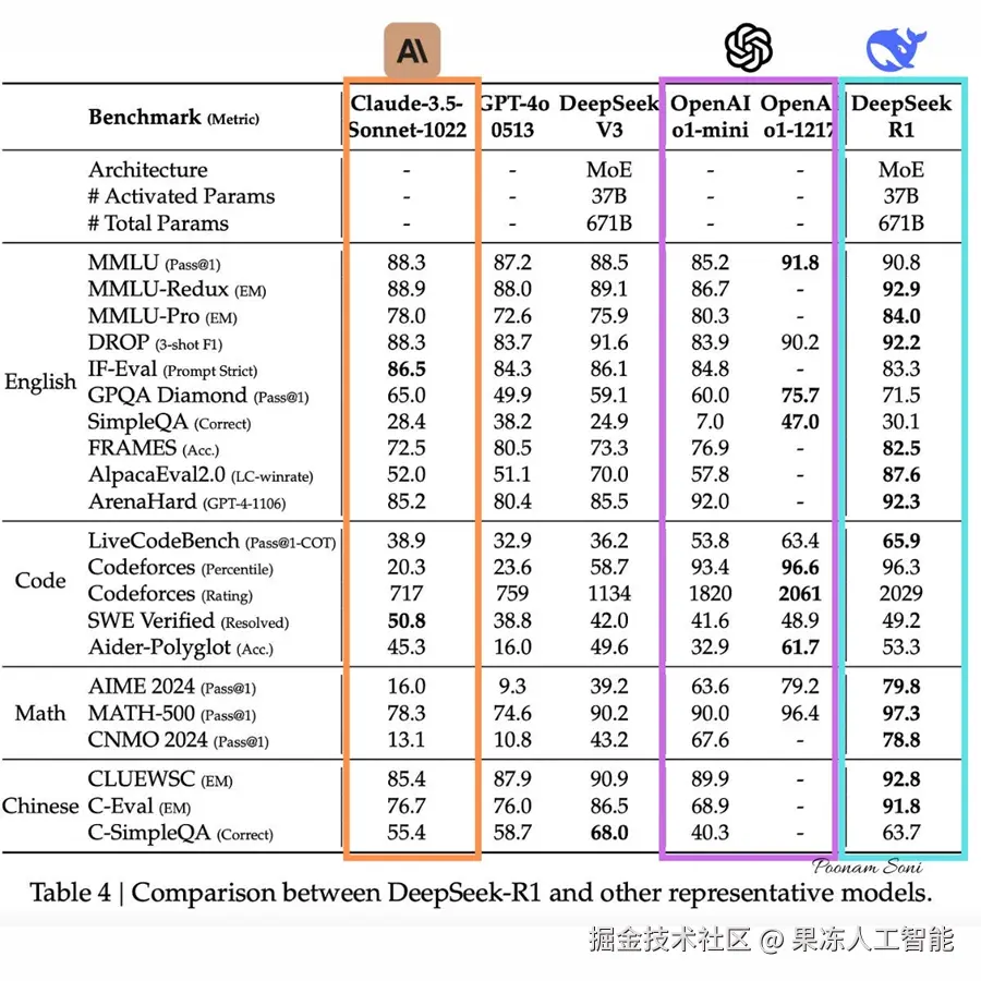 • 推理基准:DeepSeek-R1 在各种基准测试中表现出色:
