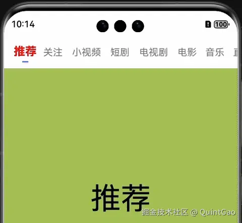 最近在学习鸿蒙开发,发现系统的Tabs不支持左右切换时标签文字的字体大小和颜色渐变,于是通过查阅相关资料及文章自己自定义了一个。先看下效果图:
